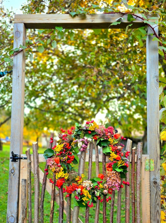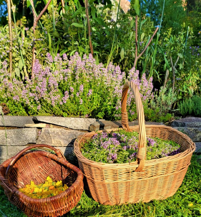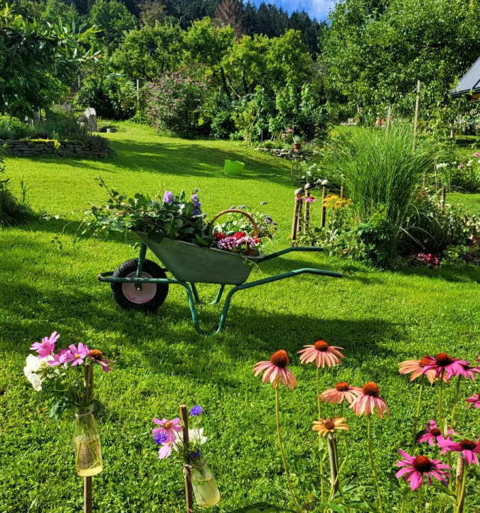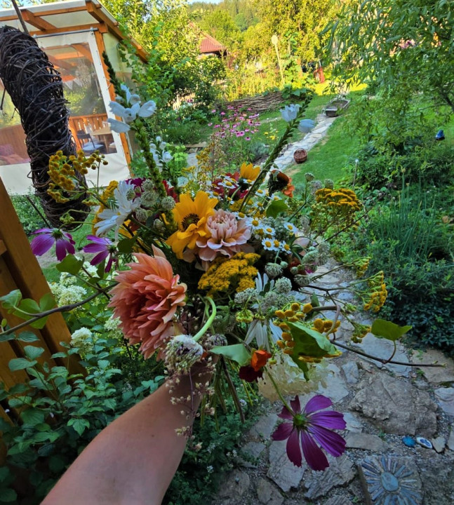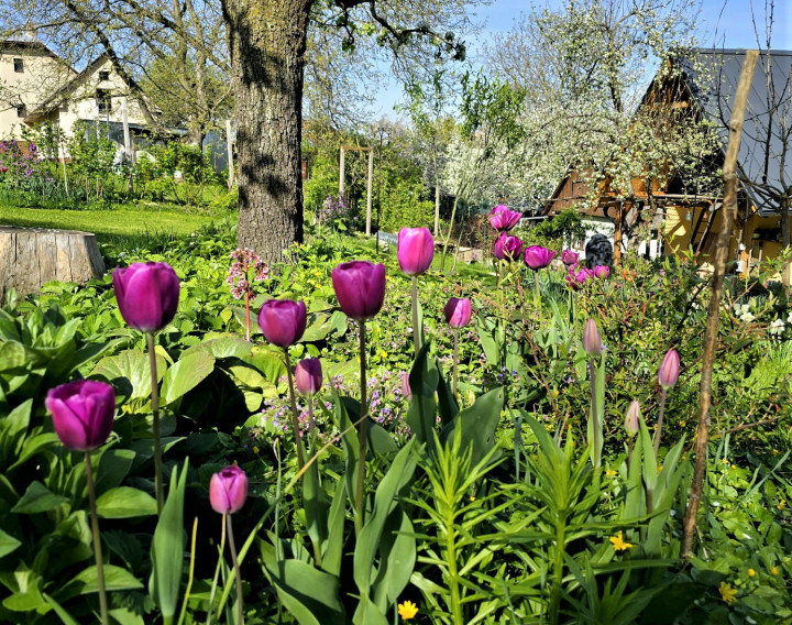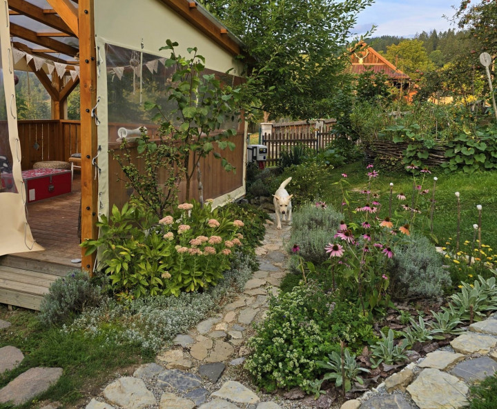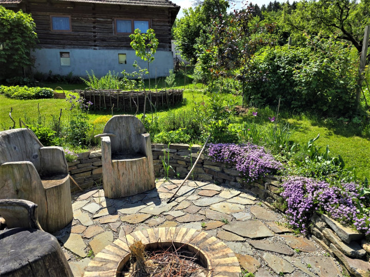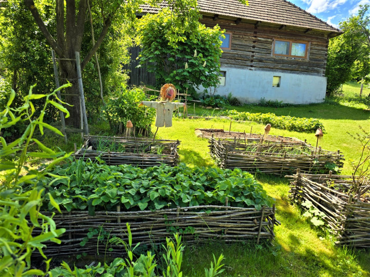 Prírodná ukážková záhrada pri drevenej chalúpke. Pestujeme tu zeleninu pre vlastnú potrebu, jedlé kry, ovocné stromy, trvalky a kvety na rez. Naše vyvýšené záhony sú vypletené z liesky ( lokálne nazbiaranej , vlastnoručne donesenej). Kompostujeme v peknom, tiež z liesok vypletenom komposte. Pri ňom sa nachádza típíčko, živá skrýša z vŕby a paviniču. Máme tu aj altánok, našu vonkajšiu obývačku s hojdačkou. Za domčekom je príjemné sedenie pod starou jabloňou obklopené vidieckymi záhonmi. Herné prvky ako hojdačky, podzemný telefón, senzorická cestička sú rozmiestnené po záhrade. V humne je záhradné náradie a chystáme sa ho zrekonštruovať. Pred domom zo severnej strany Máme tieňovú záhradku s tajnou bráničkou do studeného dedinského kúpeľa. Všade okolo domčeka sú bylinkovo trvalkové záhony. Máme tu aj z liesky vypletenú záhradku Kľúčovej dierky (keyhole garden) tu pestujeme paradajky , tekvice a čili. So susedmi na západnej strane sme si vysadili jedlú hranicu, rastú tu maliny, černice, ostružiny, budleje, liesky, josty , rakytníky a javor poľný. Ohnisko a hojdacie hniezdo s výhľadom na vrchy Malej Fatry.