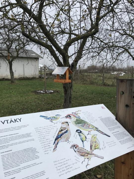 Informačné tabule s krásnymi ilustráciami a textom o prvkoch záhrady sú rozmiestnené pri každom ukážkovom biotope.