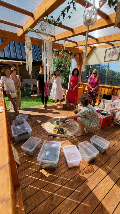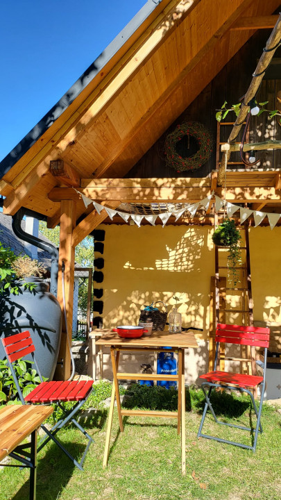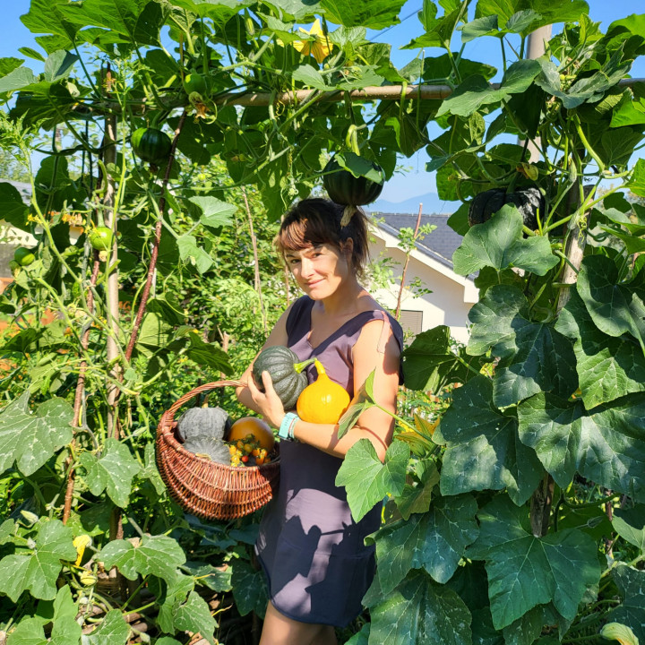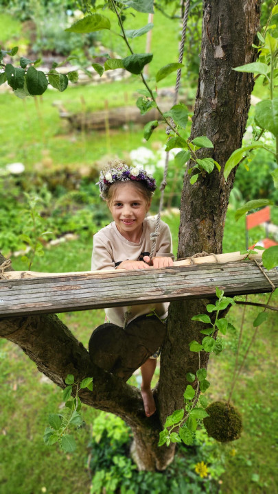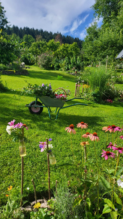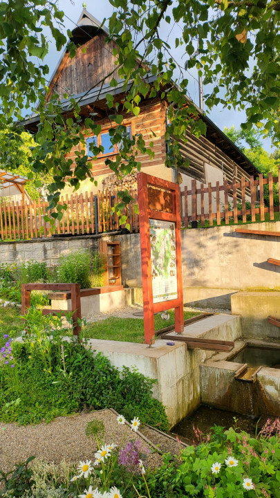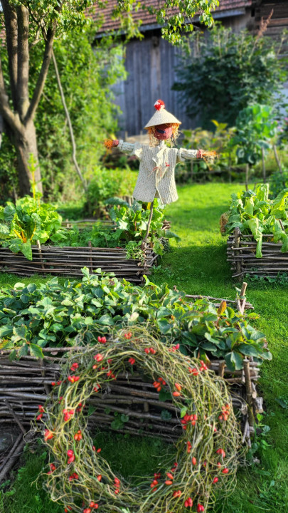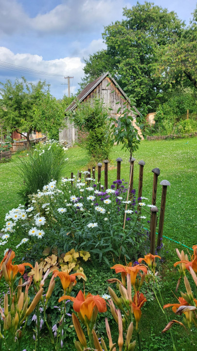 Záhrada sa nachádza na okraji dediny Belá- Dulice pri starej 120ročnej dreveničke, vo svahu. Pestujeme tu zeleninu pre vlastnú potrebu, jedlé kry, ovocné stromy, trvalky a kvety na rez. Naše vyvýšené záhony sú vypletené z liesky ( lokálne nazbiaranej , vlastnoručne donesenej). Kompostujeme v peknom, tiež z liesok vypletenom komposte. Pri ňom sa nacháda típíčko, živá skrýša z vŕby a paviniču. Máme tu aj altánok, našu vonkajšiu obývačku s hojdačkou. Za domčekom je príjemné sedenie pod starou jabloňou obklopené vidieckymi záhonmi. V humne je záhradné náradie a chystáme sa ho zrekonštruovať. Pred domom zo severnej strany Máme tieňovú záhradku s tajnou bráničkou do studeného dedinského kúpeľa. Všade okolo domčeka zú bylinkovo trvalkové záhony. Máme tu aj z liesky vypletenú záhradku Kľúčovej dierky (keyhole garden) tu pestujeme paradajky , tekvice a čili. So susedmi na západnej strane sme si vysadili jedlú hranicu, rastú tu maliny, černice, ostružiny, budleje, liesky, josty , rakytníky a javor poľný. Ohnisko s výhľadom na vrchy Malej Fatry.