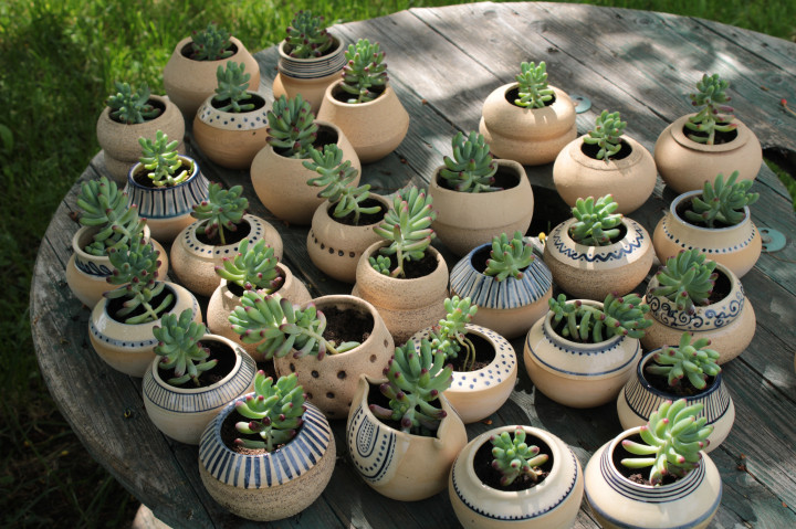 Ponuka úžitkovej keramiky a rastlín v keramických kvetináčoch z dielne,