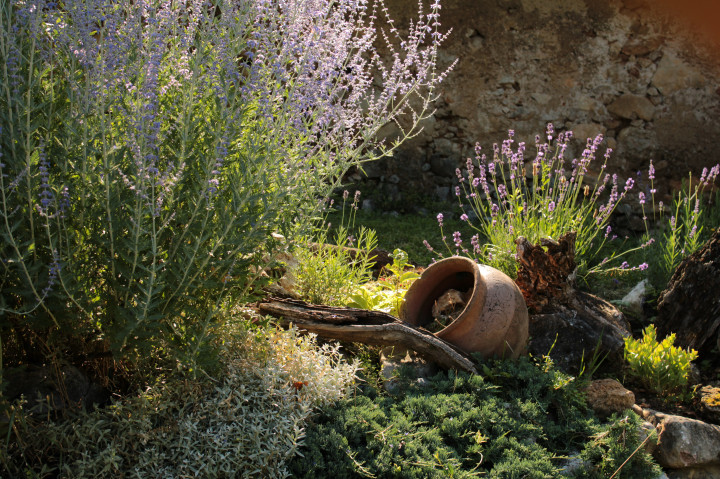 Rastlinné druhy:Staršie ovocné stromy, jablone, slivky hrušky, višňa, rezané dnes už nepoužívaným spôsobom ako dedičstvo po predchádzajúcich majiteľoch. Suché, teplé podnebie, kamenisté, vápencové podložie ma inšpirovali k založeniu levanduľového políčka o 150 kríkov. Francúzsku úzkolistú levanduľu som priviezla najmä z polostrova Tihany, zopár kríkov aj z Provensálska. Rozsiahla bylinková skalka s piatimi druhmi mäty, medovky, levandule a bazalky. Stálu zeleň tvoria rôzne druhy cyprusov upravované do guľatých tvarov. Rozmiestnenie kríkov a rastlinných ostrovčekov je na pohľad náhodné, postráda akúkoľvek geometrickú presnosť.