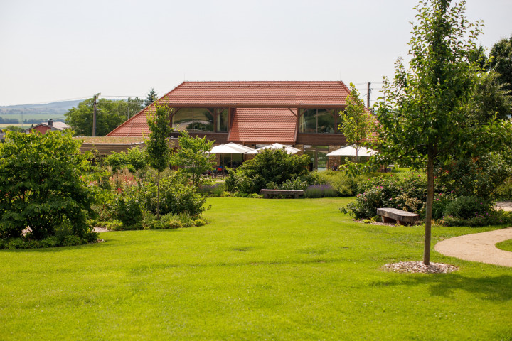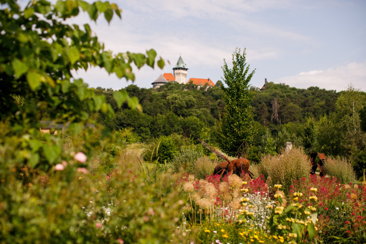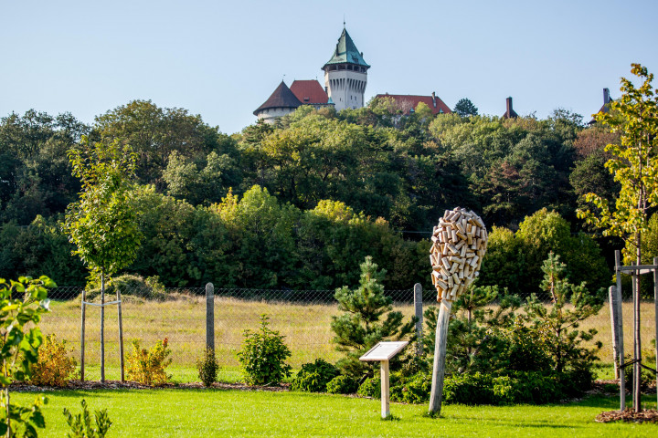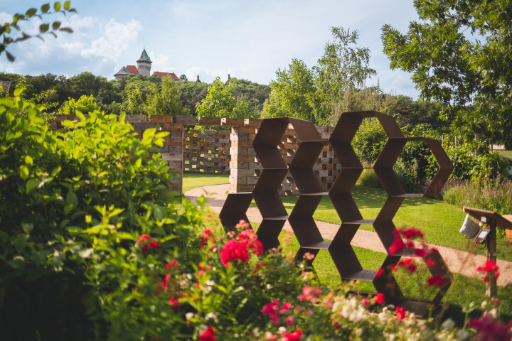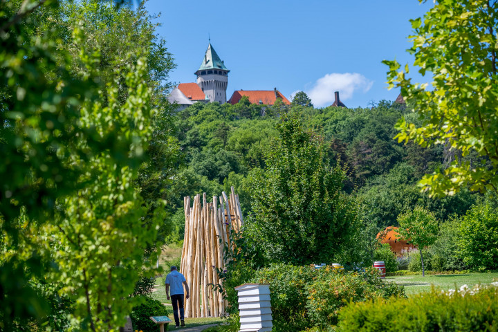 English summary:Beekeeping garden with beautiful view of Smolenice castle. Flower labyrinth, lots of flowers and bee related exhibits, with local honey café with terrace.